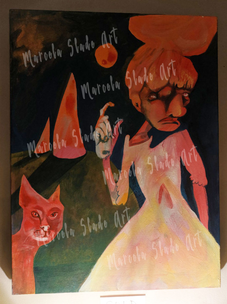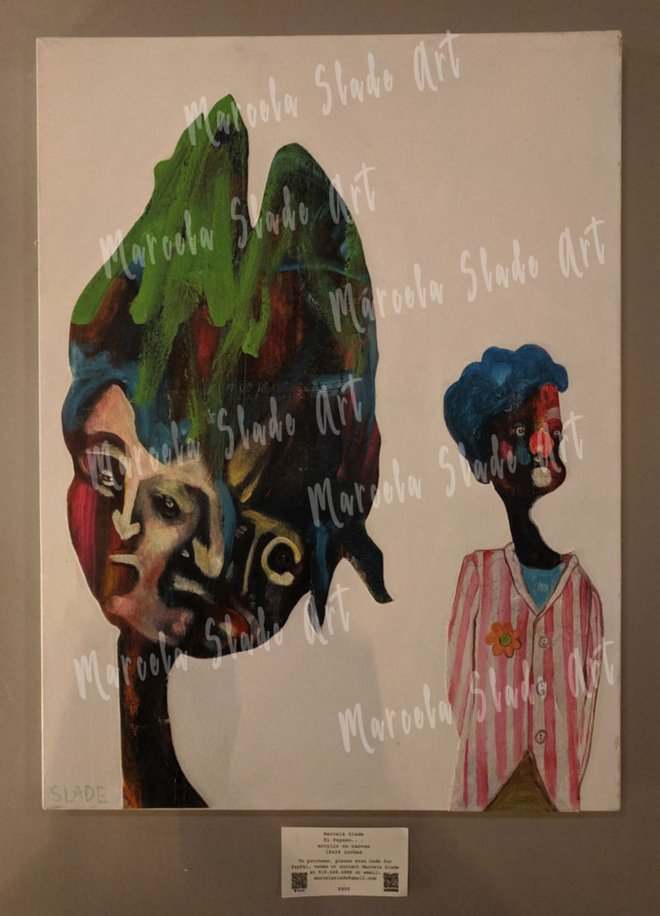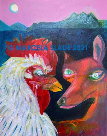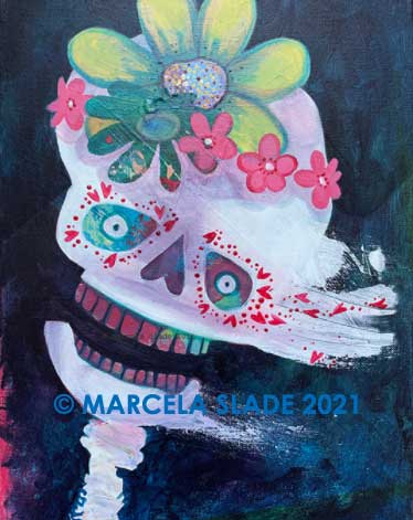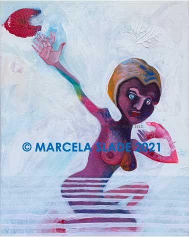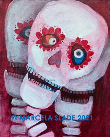 Paintings by Marcela Slade are images inspired by fascinations and preoccupations of the artist: politics, music, literature, God, death, time, and love. Her style has been categorized as expressionism with an instrumentalist twist. All pieces are original acrylics on canvas. All paintings are for sale.