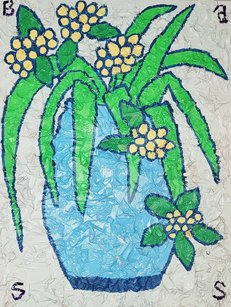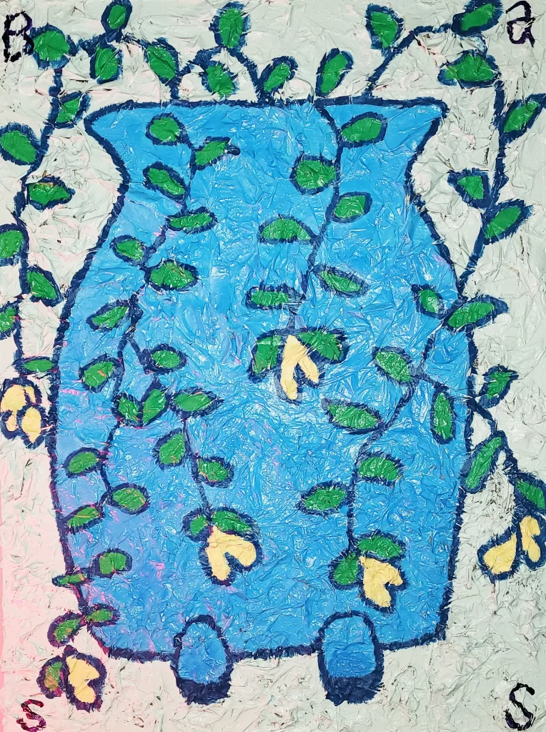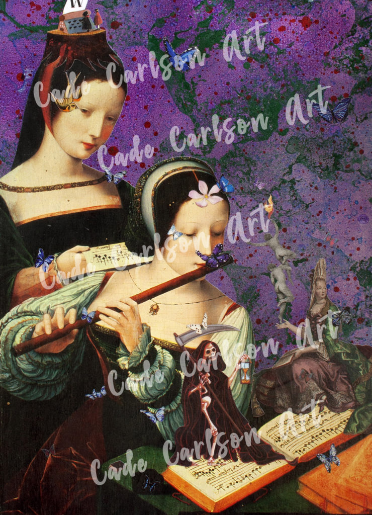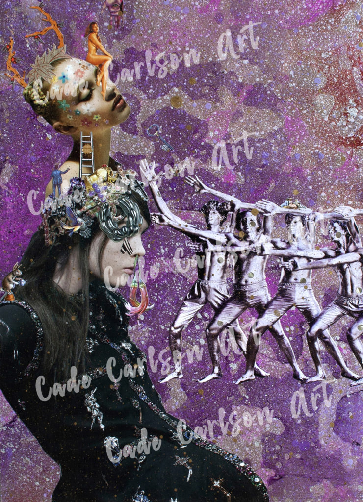 I want to give a shout out to my eleven year old granddaughter, Sophie, and her good friends Violet and Adelle. they took the time to look at and absorb the energy of many of my collages and helped me find titles for them. I also want to give a shout out to the Scrap Exchange in Durham for creating a space where everyone in the community can go to buy recycled materials to create their own arts and crafts.