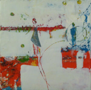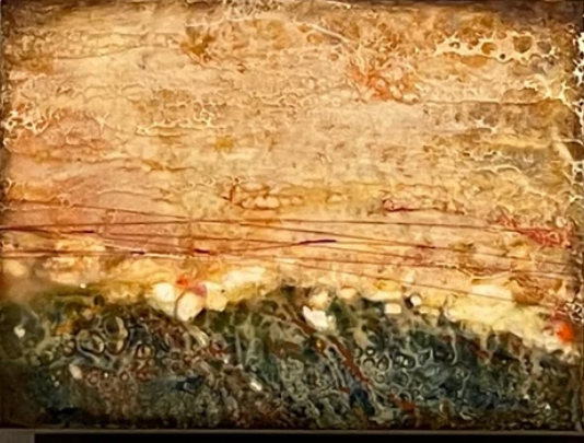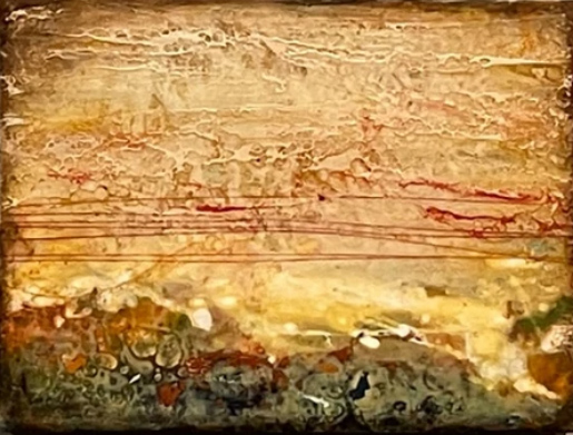 Encaustics is a medium made of beeswax, damar resin, and pigment. The paint must be molten to work, so my palette is a hotplate. The hot liquid wax is applied to a porous surface. The paint is then fused to the working surface with a torch or heat gun. Then another layer is applied and fused. My paintings incorporate many layers and are often scraped back to reveal what lies beneath.