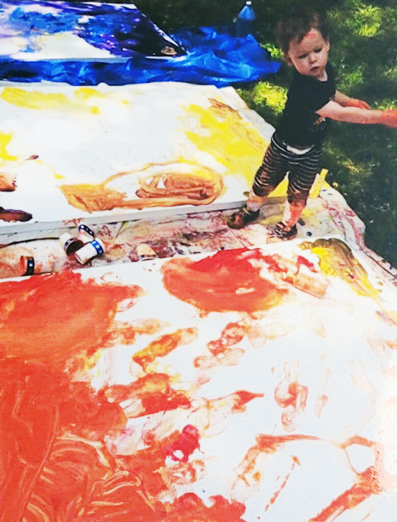 Coming from a family of artists and musicians it is hardly surprising that Jet took to painting at an early age. Here you can see the 2-year-old artist in his element, slinging paint and taking names. Guided by his faithful muse, Aunt Rainbow, Jet learned to channel the frenzied energy of a toddler into masterful drip-technique paintings.