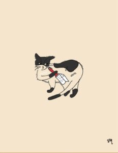 I grew up in Winston-Salem and currently live in Durham and am so honored to be able to share my art with you this month at Yonder! Yonder is one of my favorite cozy spots in the Triangle, and I love the way that they make space for artists of all kinds. When I’m not drawing condiment bottles or cats, you can find me teaching graphic design classes on Wednesday nights at the Durham Arts Council, or working at Clarkston Consulting.