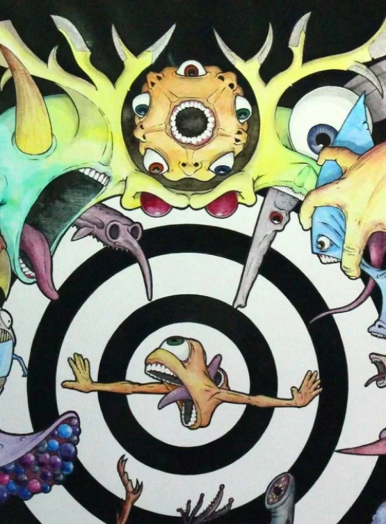 Slade’s drawing, painting, and illustration style can be categorized as expressionist/instrumentalist using distortion as a statement about human nature.